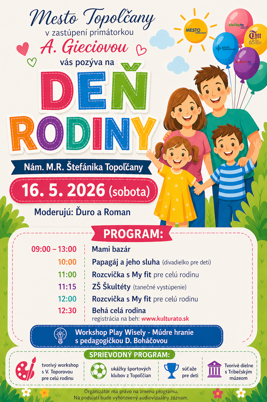 Dátum: sobota, 16. máj 2026, 09.00 - 13.00 hod. Miesto: Námestie M.R. Štefánika Topoľčany