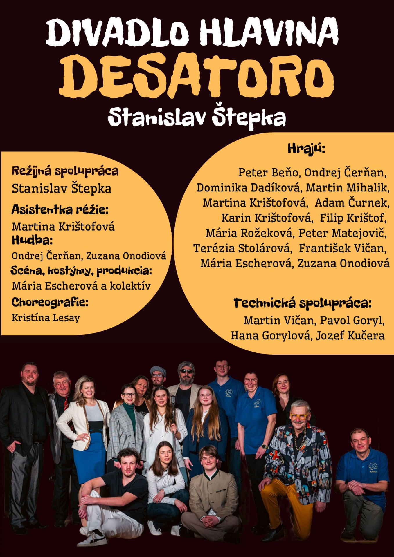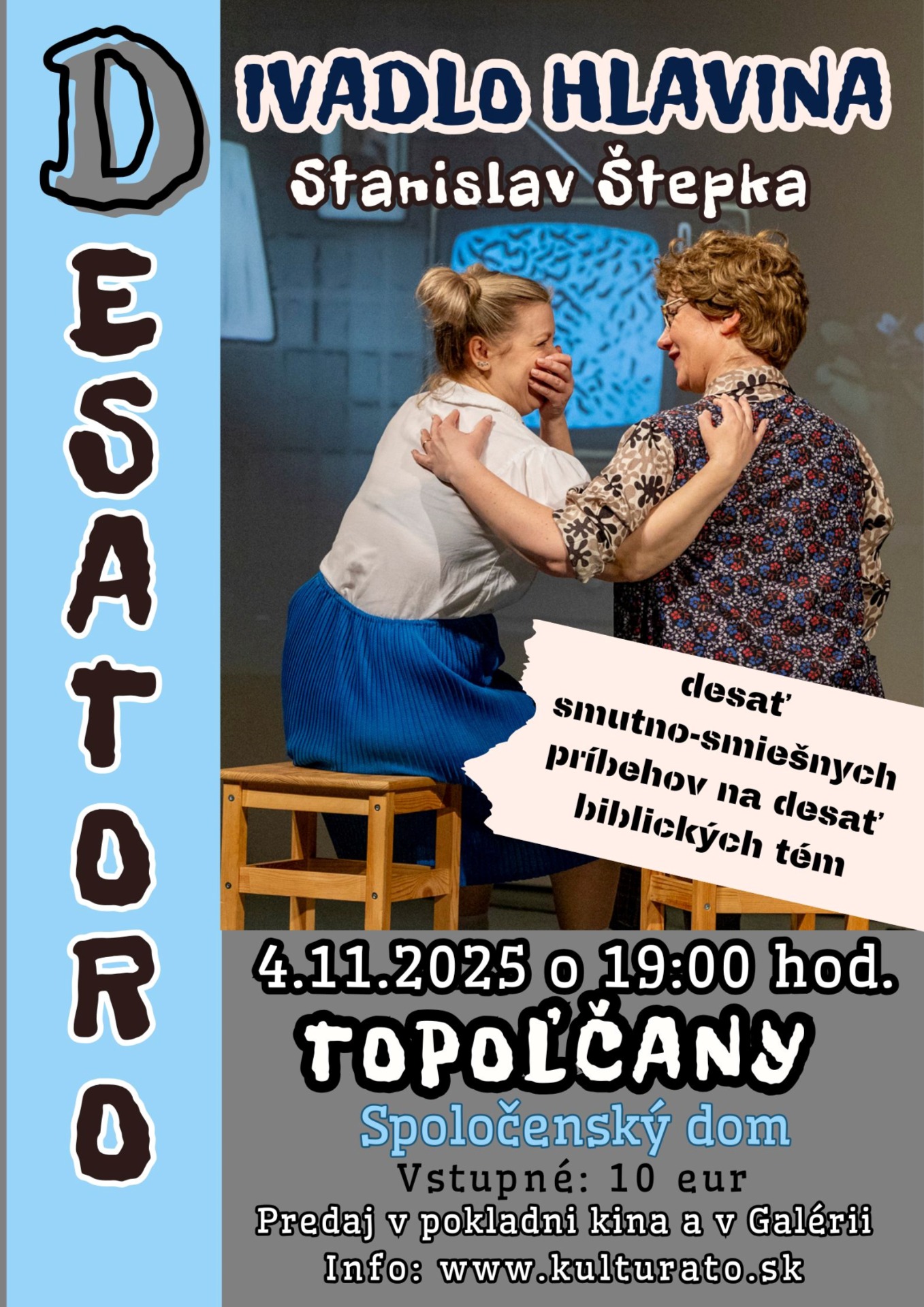 Ochotnícky súbor HLAVINA sa predstaví v Spoločenskom dome v Topoľčanoch s autorskou hrou Stanislava Štepku, DESATORO. Vstupenky sú v predaji v pokladni kina a v Galérii mesta Topoľčany. Vstupné: 10 eur. Desatoro, alebo aj desať príbehov na desať biblických tém. Prikázania po radošinsky sú inšpirované na jednej strane možno na pohľad úplne bežnými, na strane druhej aj bizarnými postavami, osudmi a situáciami. Samozrejme, vo všetkých sa nájde najmä to hlavné prikázanie, ktorým sa aj Radošinčania v divadle snažia riadiť.