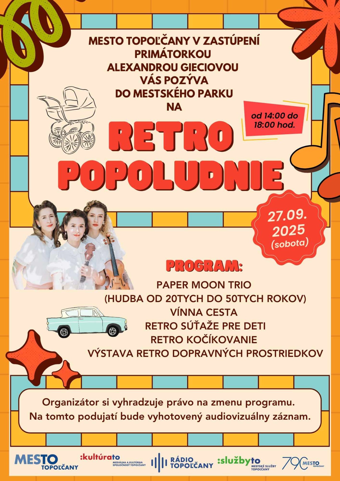 vás pozýva v sobotu 27.septembra, zažiť RETRO POPOLUDNIE do Mestského parku v Topoľčanoch, kde vám bude k dobrej nálade hrať Retro a Oldies hudba.