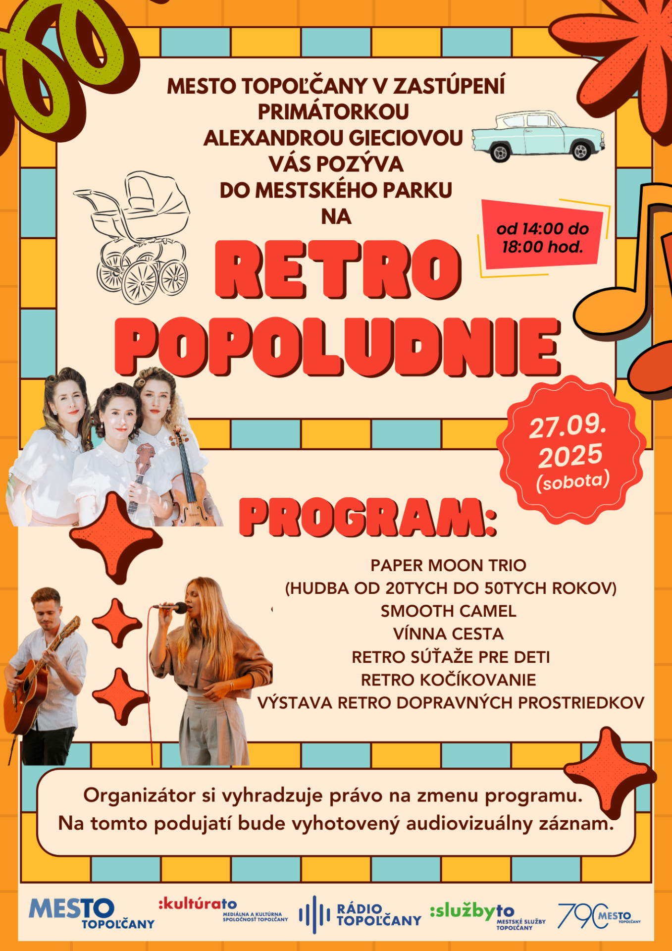vás pozýva v sobotu 27.septembra, zažiť RETRO POPOLUDNIE do Mestského parku v Topoľčanoch, kde vám bude k dobrej nálade hrať Retro a Oldies hudba.