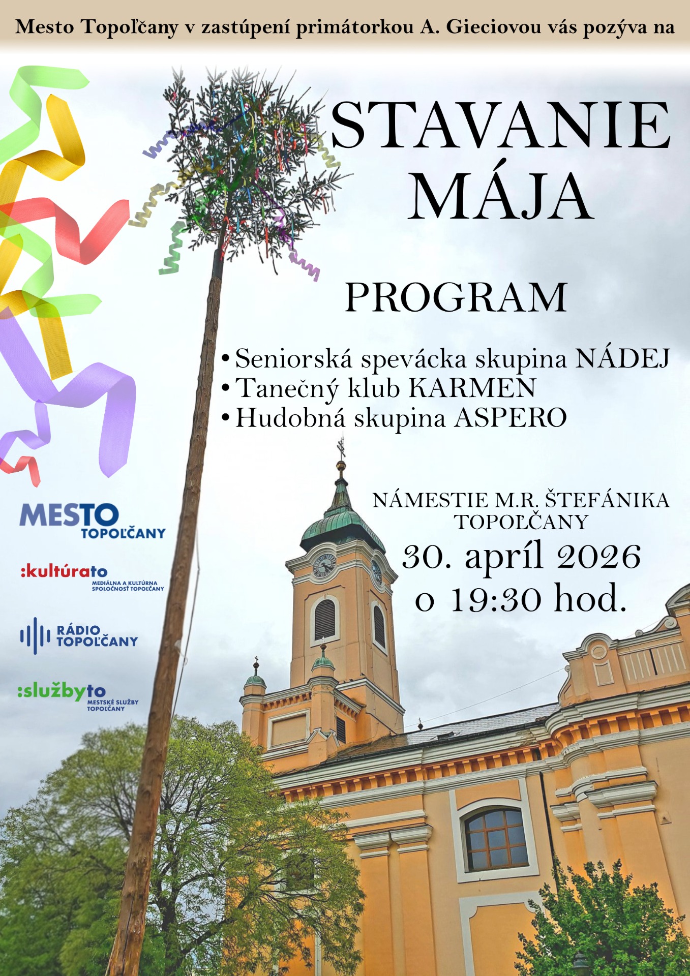 Dátum: štvrtok, 30. apríl 2026, 19.30 hod. Miesto: Námestie M.R. Štefánika Topoľčany