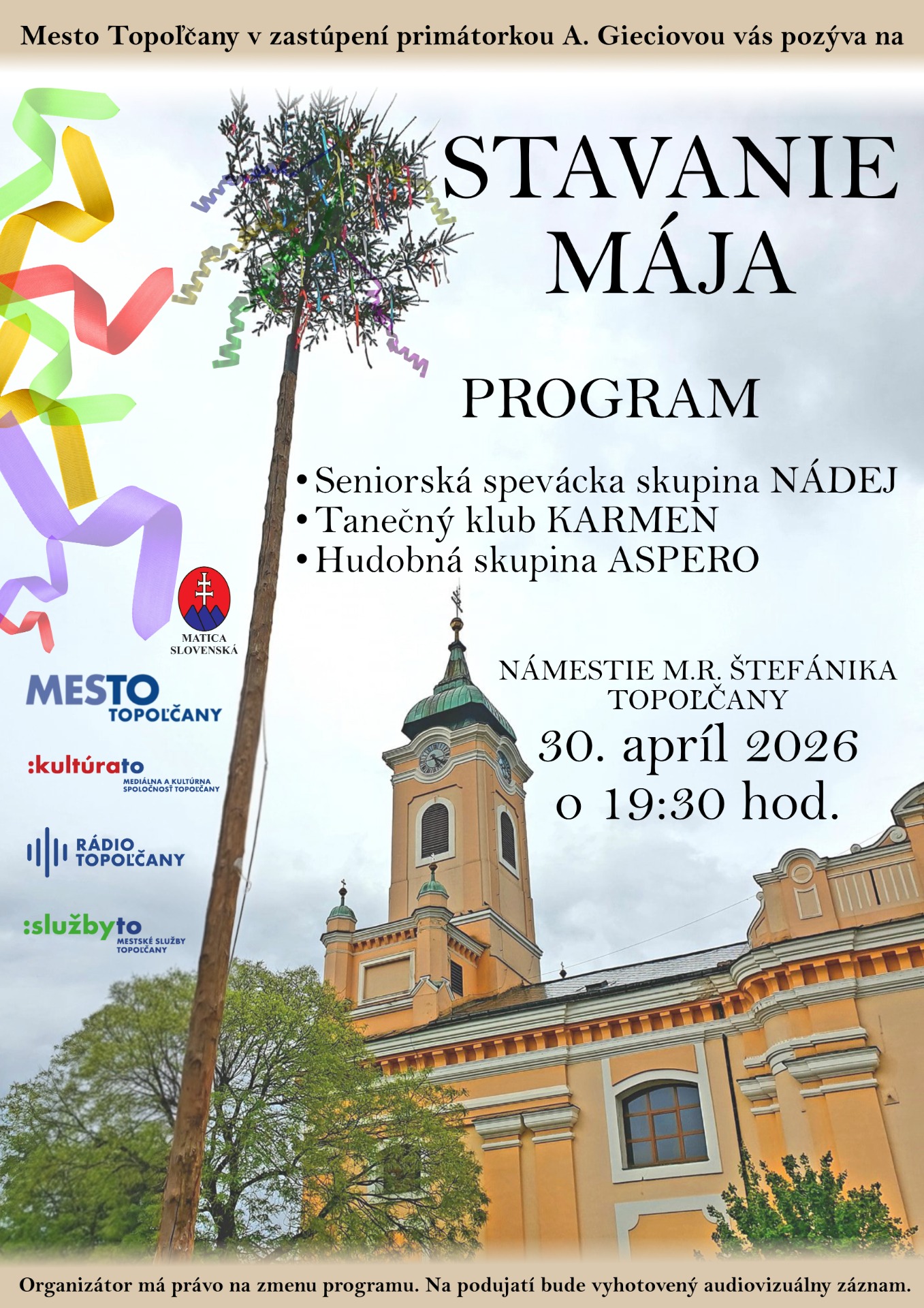 Dátum: štvrtok, 30. apríl 2026, 19.30 hod. Miesto: Námestie M.R. Štefánika Topoľčany
